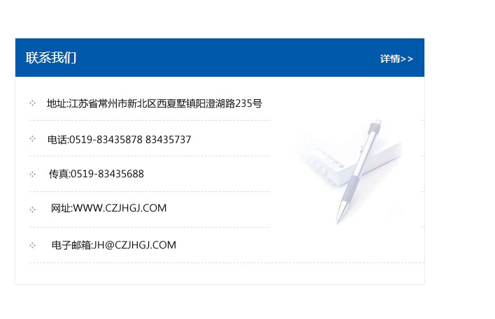 地址:常州市新北區友邦商務大廈1幢16、17層  電話:0519-85101652  傳真:0519-85112595  郵編:213022  網址:www.cz-jiayue_cn.yongxinsoftware.com  郵箱:xiajifengaa@163.com